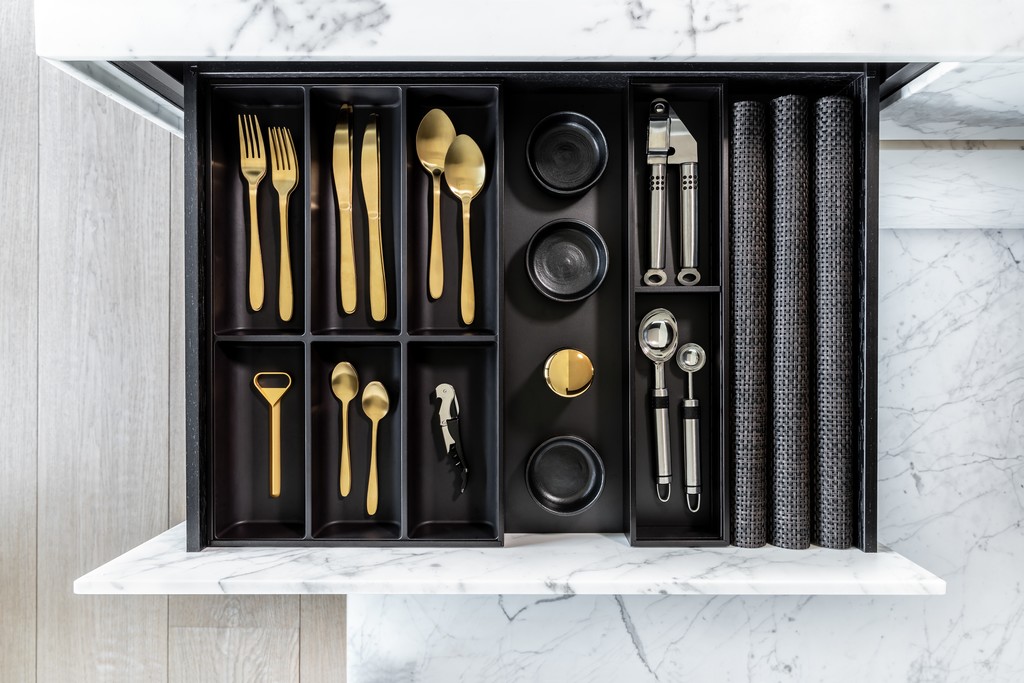 Un tiroir en désordre qui déborde d’ustensiles de cuisine : tout le monde en a un (voire plusieurs). En utilisant des séparateurs de tiroir, l’organisation de votre cuisine deviendra un plaisir et vous aurez une vue d’ensemble de tout votre matériel. Déposez des tapis antidérapants dans vos tiroirs afin que vos plats, poêles et autres couvercles ne glissent pas. Ils resteront ainsi bien à leur place.