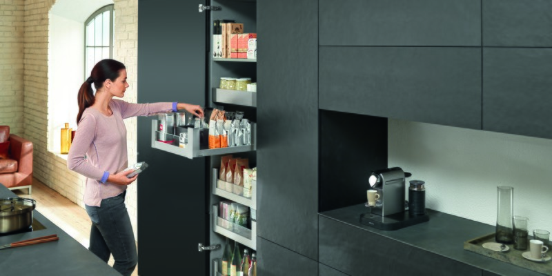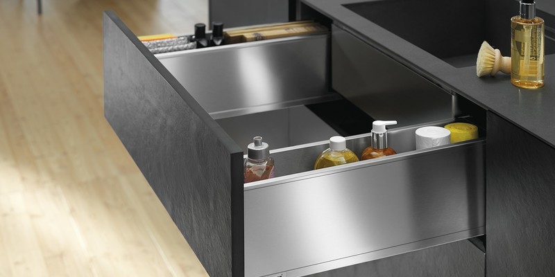 Les tiroirs LEGRABOX présentent, d'autre part, des côtés fins et droits, permettant d'utiliser toute la largeur et toute la profondeur de l'armoire. Les systèmes coulissants peuvent supporter jusqu'à 70 kg par tiroir. Vous pouvez donc y ranger également des provisions plus lourdes, comme des bouteilles.