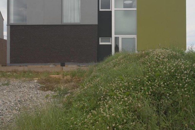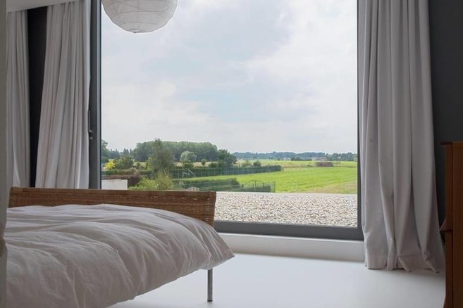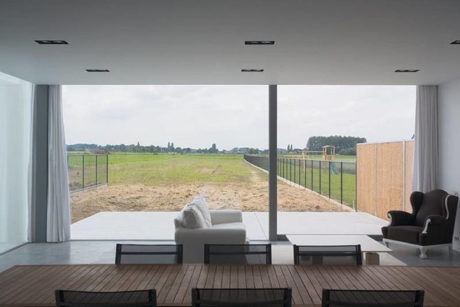 À part le respect du budget donné, le maître d’ouvrage n’avait pas de souhaits ni d’exigences particuliers. Les commanditaires ont choisi l’architecte en fonction de ses projets précédents et se sont complètement retrouvés dans sa vision et ses idées. Un des rares points fixés à l’avance était la présence de deux chambres d’enfant. « Personnellement, j’avais envie de travailler avec un toit plat, mais, dans cette commune, ce n’est pas évident. Nous avons eu la chance que les voisins de droite, dont la maison allait être mitoyenne de la nôtre, aient reçu une autorisation pour ce type de toiture. » L’architecte a opté pour une combinaison de structure métallique et de maçonnerie, qui a permis la création d’un bâtiment léger. À l’arrière, la façade est entièrement vitrée ; on peut ainsi voir toute l’étendue des champs depuis le séjour et l’étage supérieur. L’architecte a trouvé que cette mission représentait un exercice intéressant. Une maison avec trois façades est difficile en soi. Lorsque deux maisons sont jumelées, les gens les considèrent automatiquement comme un ensemble.