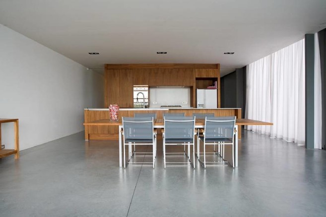 L’habitation forme un volume compact et tire de ses matériaux simples une apparence d’une grande sobriété. Sol coulé à l’étage supérieur, béton poli au rez-de-chaussée. « L’architecture coûte cher, et les détails pointus sont plus coûteux que les formules classiques. C’est pourquoi j’ai préféré une réflexion claire, traduite par des accessoires et des matériaux ‘basiques’ », explique l’architecte. « Mais la façade et l’intérieur expriment une évidente unité: une simple juxtaposition de pièces, avec une finition tout ce qu’il y a de plus rectiligne. Architectures extérieure et intérieure sont en équilibre. »