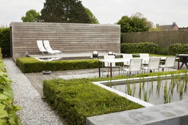 Le côté minimaliste de la maison s’en trouve adouci. La boîte miniature abrite des toilettes, un débarras et, à l’avant, une cuisine ouverte dont le plan de travail en granite Black Zimbabwe rappelle le sol en béton que revêt tout le rez-de-chaussée. L’effet n’est pas tout à fait le fruit du hasard. En limitant le nombre de matériaux utilisés, l’architecte a cherché à renforcer la sensation d’espace. Que vous vous trouviez dans la cuisine ou assis dans le canapé, la vue sur le jardin est omniprésente par ailleurs. Les deux derniers mètres du séjour ont en effet été rehaussés de trois mètres pour que vous jouissiez de la vue derrière la grande baie vitrée. Les fenêtres qui s’étirent sur toute la hauteur et la largeur de la pièce invitent royalement la nature dans le salon. Intérieur et jardin ont d’ailleurs été aménagés simultanément : ils sont tout simplement indissociables. Ainsi les nombreux éléments transversaux du jardin – plans d’eau, terrasse, abri de jardin – contribuent-ils à élargir visuellement le terrain. Les roseaux et les pierres de lave qui agrémentent le premier bassin filtrent l’eau de l’étang de baignade qui trône au fond du jardin. Le large bord fait quant à lui office de banc.