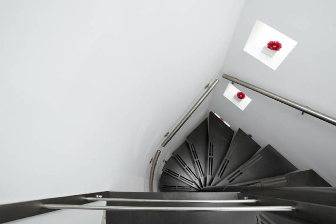 Cet escalier au design contemporain est signé VDV Ferronnerie. Toujours à la recherche de concepts novateurs, cette entreprise crée des escaliers en métal qui sortent du lot. Le contraste entre le noir et le blanc des murs offre ici un résultat raffiné et moderne. Étant donné que cet escalier à vis en acier thermolaqué a été installé dans un coin de l’habitation, il n’était pas nécessaire d’installer un garde-corps. Une main courante suffisait amplement. Celle-ci est en inox et apporte une touche de légèreté à cette réalisation. Par ailleurs, pour accroître davantage encore la sécurité des utilisateurs, de fines bandelettes ont été découpées au laser dans l’avant de chaque marche. Et grâce aux petites fenêtres, cet escalier est baigné de lumière naturelle toute la journée.