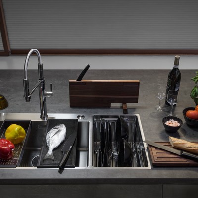 L’époque où l’évier ne servait qu’à faire la vaisselle est révolue. Ces dernières années, l’évier est devenu un poste de travail polyvalent au cœur de la cuisine : on y lave les légumes, on y coupe des aliments, on y fait la vaisselle. Si l’on a une cuisine compacte, il est particulièrement important d’optimiser l’espace disponible. C’est pourquoi Franke combine l’évier traditionnel avec des unités supplémentaires dotées d’un cadre qui permet de ranger les accessoires de cuisine. Résultat : vous créez un confort de cuisine optimal et vous vous simplifiez la vie, de la préparation des aliments au nettoyage.