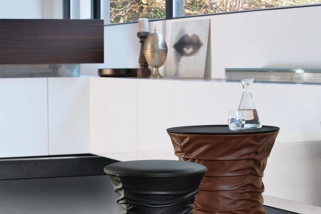 Particulièrement ludique, sur le stand de Walter Knoll, la Bellows Collection du designer Toan Nguyen. La collection de petits tabourets et de tables est habillée de cuir souple plissé. En fait, ces plis permettent d’étirer la chaise ou la table. Le cuir dissimule un ingénieux système de pompe qui permet de régler la hauteur de la chaise, ou de la table, en exerçant une pression sur un anneau situé sous l’assise ou sous la tablette. La collection est disponible dans toute une gamme de coloris neutres et s’utilise regroupée ou en complément au sofa.