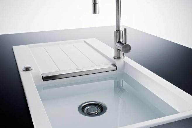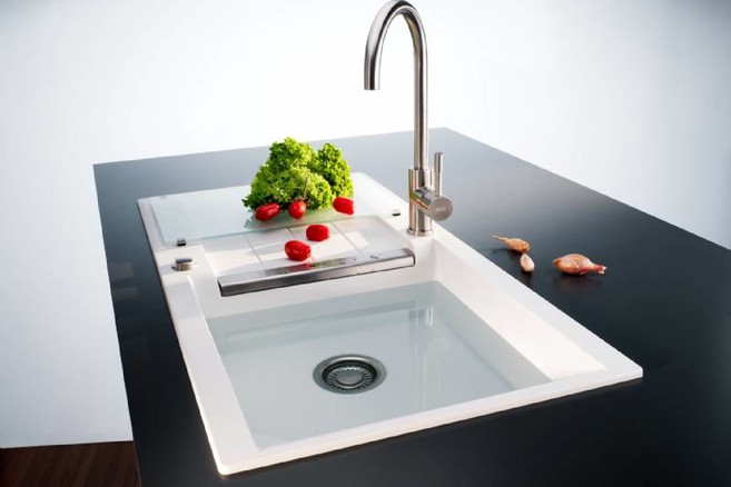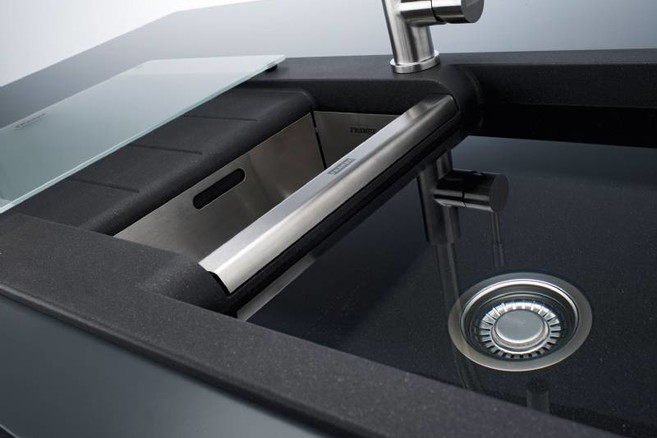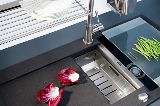 Les accessoires forment un tout avec l’évier, et ils contribuent à l’optimisation des tâches dans la cuisine. Les éviers JAVA possèdent un panier en acier inoxydable dans lequel vous pouvez rincer les fruits, égoutter les pâtes, etc. La planche à découper en verre coulisse sur toute la longueur de l’égouttoir. Associée au panier, la planche forme un ensemble très pratique : vous coupez les légumes sur la planche et vous faites simplement glisser les morceaux d'un seul geste dans le panier pour les rincer. Quoi de plus simple? Franke a également prévu un panier à vaisselle pour égoutter celle-ci.