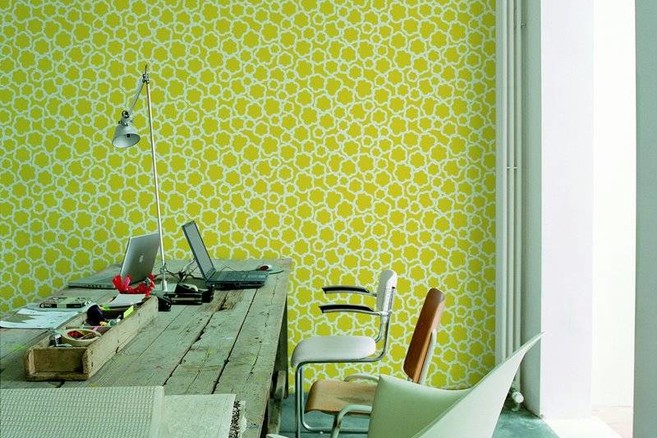 - City Cow – Une vache en costume trois pièces? Avec ce chef d'œuvre doré, l'artiste londonienne Pamela Howard fait un clin d'œil à la 'City'. Les lignes ondulées du costume sont grossies en un seul motif en relief. Voilà qui donne naissance à un papier peint amusant mais néanmoins très élégant. Aussi bien dans les teintes foncées et dominantes (black et rust) que dans des tons plus sobres (linen et beige).