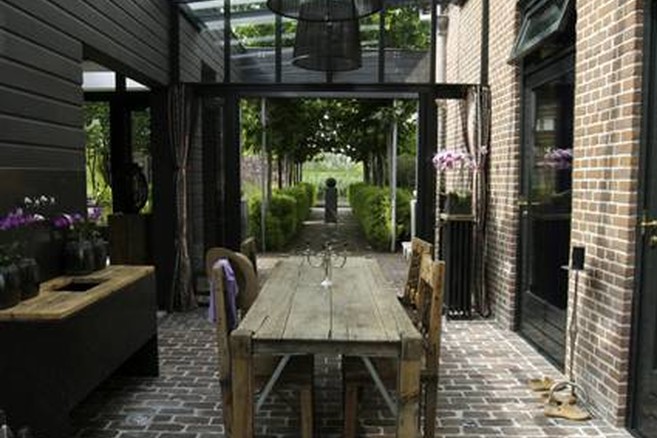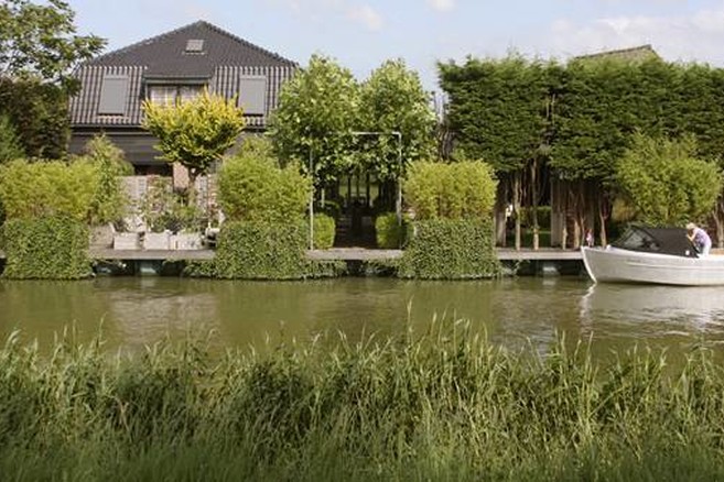 Le mur ceinturant la parcelle joue lui aussi un rôle important dans la configuration du jardin. « Nous avons cherché de vieilles briques ressemblant à celles de la maison. Si vous regardez de plus près, vous verrez qu’elles sont encore couvertes de résidus de chaux. » Des persiennes accrochées au mur marquent la séparation entre le jardin et le bord de l’eau. « Elles ont été confectionnées par des décorateurs de théâtre avec du bois de récupération provenant d’un ancien ponton. C’est joli et, en plus, j’étais assurée qu’on ne devrait pas abattre d’arbres pour fabriquer mes volets. C’était très important à mes yeux », insiste Liesbeth. « Habiter le long de l’eau présente beaucoup d’avantages. Quand il fait beau, c’est un vrai bonheur. Mais si nous n’avons pas envie d’être dérangés par les bateaux qui passent ou les promeneurs de l’autre côté de la rivière, il nous suffit de fermer les volets pour retrouver notre intimité. »