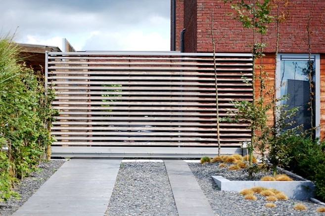 Une rampe d’accès longiligne amène la voiture jusqu’au carport situé dans le jardin de derrière en franchissant un portail coulissant en bois, de conception moderne. La rampe n’a pas été pavée entièrement, mais se compose de deux bandes de pierre de taille lisse qui parcellise tout un plan d’ardoises rugueuses. C’est beaucoup plus attrayant que si toute l’allée avait été pavée de clinkers. Les bandes de pierre bleue garantissent une fonctionnalité optimale. La bande d’ardoise la plus large est utilisée par les occupants comme rampe d’accès à la porte arrière. Les dimensions généreuses suffisent largement pour passer avec un buggy ou un vélo, …