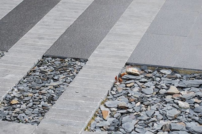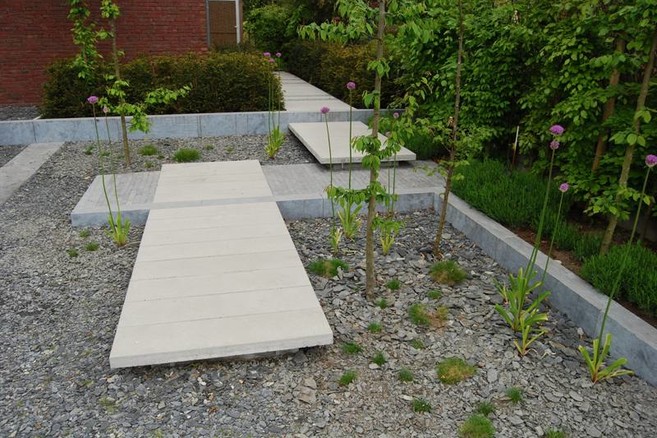 A l’instar des plantations, le choix des matériaux se veut aussi très sobre. Des dalles de pierre taillée de différents formats sont combinées à des galets d’ardoise plats. L’aspect quelque peu biscornu de cet ensemble offre un magnifique contraste avec les lignes épurées et lisses de la pierre de taille et des dalles en béton. Les différences de niveau ont été absorbées par des murets de pierre de taille. La teinte gris clair des mégadalles longilignes est en harmonie avec la teinte rouge brique de la maison et offre un contraste avec la teinte bleue des autres matériaux (gravier, pierre de taille) et des plantations (lavandes, alliums).