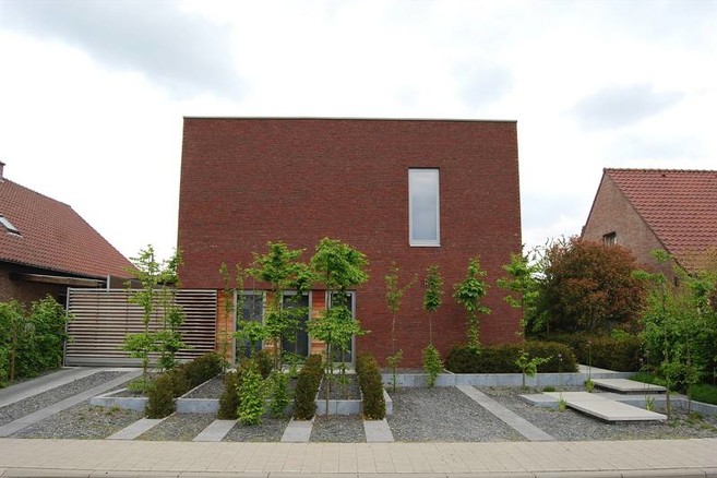 A côté de la rampe d’accès, un espace a été réservé pour y garer une voiture. Il est très compliqué d’intégrer un parking dans une aussi petite parcelle. En revanche, un parking parfaitement délimité ne serait pas du tout de mise ici. L’espace de parking n’a donc pas du tout été délimité mais simplement recouvert de gravier, comme ailleurs dans le jardin. De cette manière, l’espace de parking s’intègre entièrement au jardin de devant et se prolonge, discrètement, dans les parties adjacentes du jardin.
