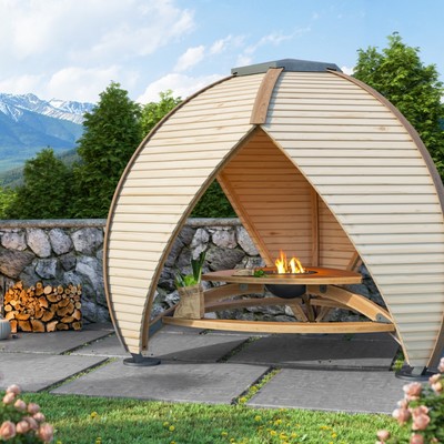 Le Shield s’adapte parfaitement au-dessus d’un jacuzzi ou d’un barbecue. Vous adorez manger à l’extérieur ? Équipé d’une table et d’un banc, le Shield forme un lieu accueillant pour l’apéro, voire pour le café, tout en profitant de la vue. Vous pouvez également installer un braséro au centre de la structure, idéal pour vous réchauffer ou pour vous préparer une grillade.
