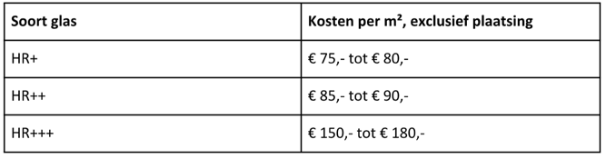 Wat zijn de kosten van HR-glas? Voor het plaatsen van HR-glas betaal je meer dan voor enkel- of dubbelglas, maar je kunt flink besparen op de energierekening. Voor HR+ glas moet je rekening houden met een prijs van € 75,- tot € 80,- per m². Voor de nog energiezuinigere variant, HR++, betaal je € 85,- tot € 90 per m². Dan heb je nog HR+++ glas. Hier leg je gemiddeld € 150,- tot € 180,- per m² voor neer. Deze prijzen zijn allemaal exclusief de kosten voor het laten plaatsen van glas.