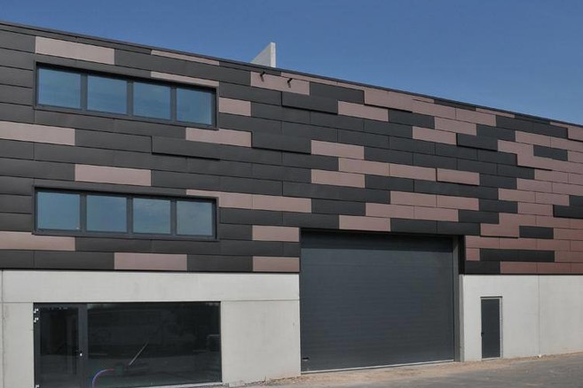 De nieuwe showroom werd gedeeltelijk bekleed met deze zinken cassettes. Brugs Dak Centrum koos voor een harmonieuze combinatie van Pigmento rood en Anthra-Zinc en een samenspel van VMZ Mozaik-cassettes in 3 dieptes (40, 60 en 100 mm).