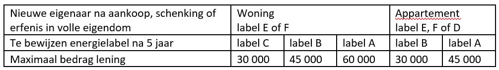 Wie een woning met label F of E verwerft en deze binnen de 5 jaar energetisch verbetert tot een woning met label C, B of A, kan vanaf 2021 een renteloze lening aangaan van respectievelijk 30.000, 45 000, 60 000 euro. Bij appartementen gaat het om de renovatie van label F, E of D naar label B of A. Nieuwe eigenaars van appartementen kunnen vanaf volgend jaar tot 45.000 euro renteloos lenen als ze hun appartement van label F, E of D renoveren tot label B en tot 45.000 euro als ze renoveren tot label A.