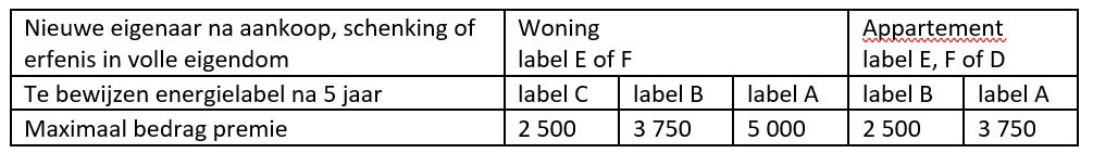 Daarnaast zullen nieuwe eigenaars in 2021 ook aanspraak kunnen maken op een zogenaamde ‘labelpremie’ wanneer binnen de 5 jaar de woning of het appartement grondig energetisch wordt gerenoveerd.