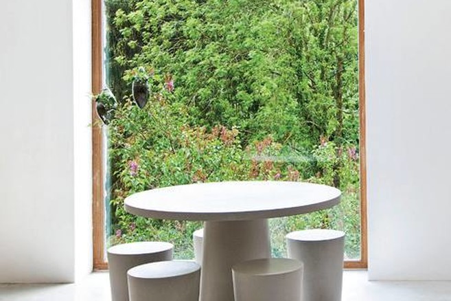 Beton is de rode draad in dit project. Het vormt de vloerplaat voor de hele gelijkvloerse verdieping. Ook het terras, aangelegd in het verlengde van de binnenvloer, is in beton gegoten, net zoals het grote werkblad in de keuken. “Beton drukt volgens ons een uitgesproken eigentijds karakter uit, zonder te ontaarden in stijl- of mode-effecten. De bouwheer wilde een krachtige maar ook kernachtige ingreep.