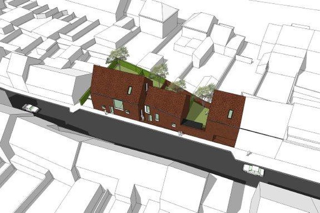 'Goed gebruik van omgeving en terrein. Het ontwerp volgt de rafeligheid van de omgeving. De keuze voor slechts vier ondiepe woningen is eveneens een keuze voor kwaliteitsvolle buitenruimten. De straat en het terrein vragen een bedachtzame architecturale invulling. Dit ontwerp biedt een origineel accent zonder opvallend te zijn; hedendaagse gevels, ouderwetse maar sympathieke volumes.'