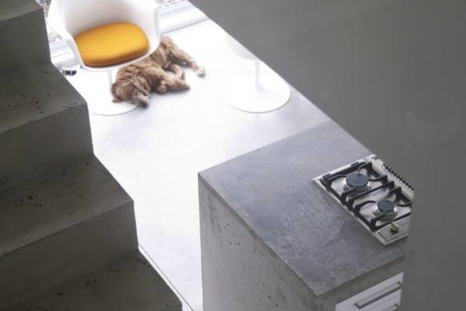 Florence: “Ongetwijfeld. We hebben het materiaal trouwens niet enkel toegepast als vloerbekleding, maar ook voor de uitvoering van de trap en zelfs voor het keukenwerkblad. Maar in dit project vind je ook een luxueuzer materiaal: de badkamer is uitgevoerd in mortex, een product op basis van kalk en gekleurde hars. Het is een duurder materiaal dat vooral voor de realisatie van zwembaden wordt gebruikt. Na behandeling wordt het waterdicht terwijl het wel zijn mooie beton-achtige uiterlijk behoudt. Bovendien heeft mortex niet het gewicht van beton, wat ook een belangrijk voordeel is.”