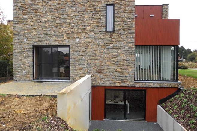 Het strakke karakter van de woning wordt doorbroken door de ‘on-strakke’ geel-grijze breuksteen van de gevels die aansluiten bij de landelijke omgeving. De optimale benutting van de woonoppervlakte resulteerde in een quasi vierkante blok waarbij enkel op de verdieping twee uitsnijdingen plaats bieden aan de dakterrassen. Om het volledige programma te realiseren en de woning toch zo compact mogelijk te houden, bracht de architect het thuiskantoor onder in de kelder. Het grote raam van de werkruimte geeft voldoende daglicht en kijkt uit op de groene talud en de tuin.