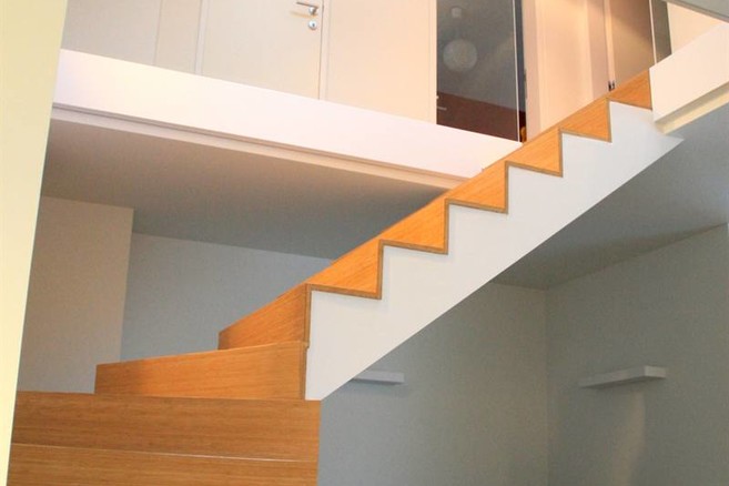 De woning bestaat uit 2 bouwlagen en een kelderverdieping. Op de gelijkvloerse verdieping bevinden zich de woonruimtes en de berging. De keuken, eet- en zithoek liggen aan de tuinzijde terwijl leeshoek, inkom en de berging aan de voorzijde van de woning grenzen. Zo ontstaat er een maximale aansluiting van de woonruimtes met de tuin. Centraal in de woning staat de trap met vide die toegang geeft tot 4 slaapkamers en 2 badkamers op de verdieping. In de kelder zijn het bureau, de garage en een extra berging ondergebracht. De bureauruimte ligt aan de achterzijde van de woning en kijkt uit op een groene talud met verbinding naar de tuin.