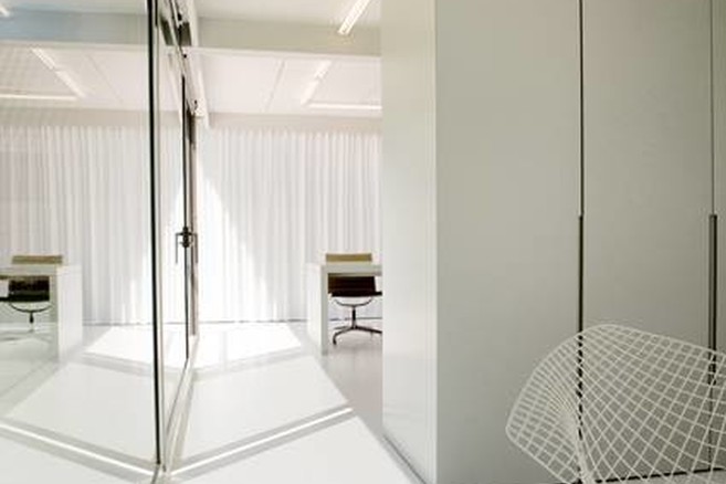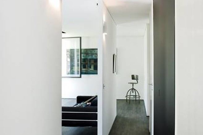 Het nieuwe interieur van de woning kreeg minstens even veel aandacht. Niet verwonderlijk, aangezien Arjaan nu weliswaar professioneel bezig is met totaalconcepten, maar van oorsprong vooral interieurarchitect is. “We wilden binnen twee verschillende sferen creëren”, doet hij het verhaal. “Beide verdiepingen wilden we zo open mogelijk houden, maar op de benedenverdieping – de kantoorruimte – mocht de sfeer wat zakelijker zijn, terwijl het woongedeelte op de eerste verdieping warmte moest uitstralen. Om de zakelijke sfeer te creëren, hebben we uitsluitend gekozen voor witte en lichtgrijze tinten, zoals de gegoten polyurethaanvloer en de op maat gemaakte, lichtgrijs gelakte MDF-kasten die tegelijk als scheidingswand dienst doen. Verder vallen ook de steeds terugkerende lijnen op. Het gebouw bestaat immers uit gelijke vlakken en dat wilden we in alles laten terugkomen. Over de exacte plaats en richting van de lampen of de breedte van de kasten hebben we zeer precies nagedacht, zodat alles tot in het detail klopt. Details kunnen immers het verschil maken.”