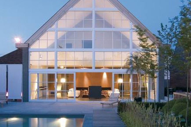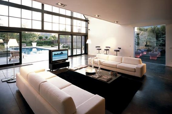 Hoewel openheid ongetwijfeld het belangrijkste kenmerk is van dit project, is de woning toch duidelijk opgedeeld in verschillende compartimenten. Aan ruimte is er overigens nergens een gebrek: de bewoonbare oppervlakte van de totale woning bedraagt maar liefst 550 m2. De benedenverdieping bestaat uit een grote leefruimte, een gezellig loungegedeelte en een gewaagde keuken. De verschillende ruimtes lopen in elkaar over, maar kunnen desgewenst ook van elkaar worden afgesloten.