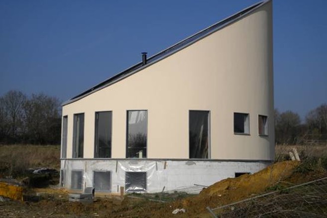 Deze cilindrische woning heeft de uitdaging tot originaliteit gewonnen, zowel betreffende vorm, als energieverbruik en techniek. Gelegen in Braine-l'Alleud, Waals-Brabant, wordt de woning momenteel bekleed met een buitenafwerking.