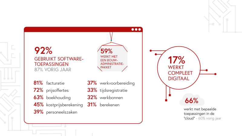 De bouwsector heeft ook het voorbije jaar digitale stappen vooruit gezet. 90 procent van de bouwkmo’s is online te vinden, tegenover 83 procent vorig jaar. 55 procent is actief op sociale media, vorig jaar was dit nog 49 procent. 66 procent werkt in de cloud (60 procent vorig jaar) en 92 procent maakt gebruik van softwaretoepassingen (87 procent vorig jaar).