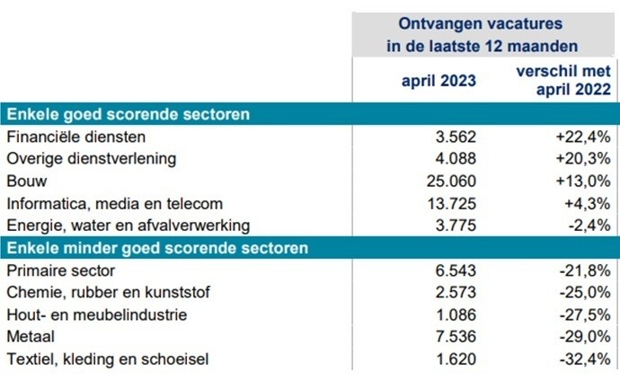 Van mei 2022 tot april 2023 zijn er voor de bouwsector een nieuw recordaantal van meer dan 25.000 vacatures in Vlaanderen (met inbegrip van het Brussels Hoofdstedelijk Gewest) ontvangen bij de VDAB (zie tabel als bijlage). Op het einde van de maand april staan er daarvan nog steeds 7.312 vacatures open, dat is bijna 1 op 3.