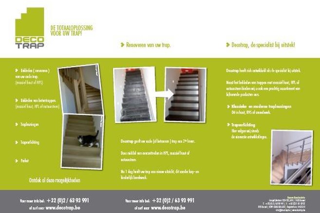 Trappen zijn bij een interieurrenovatie een van de moeilijkste objecten om aan te pakken. Nochtans kunnen oude houten of betonnen trappen op een eenvoudige manier een stijlvolle facelift krijgen. Decotrap legt in deze brochure uit hoe zij een trap er opnieuw als nieuw laten uitzien door de structuur te bekleden met HPL, massief hout of natuursteen.