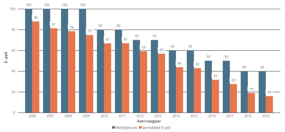 Uit: de EPB-cijfers op energiesparen.be - het gemiddelde en wettelijke E-peil per aanvraagjaar