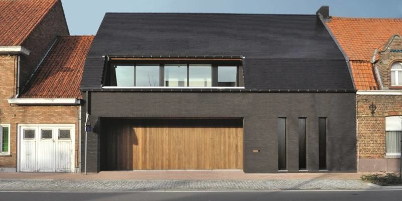 Stedenbouwkundig moest het mansardedak behouden blijven. De ontwerper maakte er een pluspunt van. Hij doorbrak het grote dakvlak met een inpandig terras dat dezelfde lijn volgt als het terugspringend gevelvlak in hout waarin de garagepoort en de voordeur zitten. De voorgevel werd zo gesloten mogelijk gehouden, met alleen nog drie verticale ramen. Materiaalgebruik en kleur staan in het teken van de minimalistische benadering. Zwarte tegelpannen kregen de voorkeur boven zink omwille van de sterkere esthetische kracht en de betere prijszetting. De grafietzwarte gevelsteen voegt zich perfect in deze visie. Door de gevelsteen toon-op-toon te voegen, krijgt de gevel een sterke uitstraling.