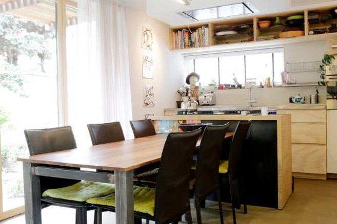 Uiteraard tekende Martine zelf het plan voor haar vernieuwbouw uit. Ze koos voor een energiebewuste woning met bio-ecologische bouwmaterialen. In concreto: een houtskeletbouw, volledig luchtdicht geïsoleerd met papiervlokken. “Oké, houtskeletbouw is duurder dan een traditionele bouw in baksteen. Maar het bespaart je wel veel slijpwerk voor alle leidingen. En het is makkelijk te isoleren. De muren, het dak en de tussenvloer waren op één dag gevuld met papiervlokken. De douchewanden en de vloeren werkte ik zelf af met Mortex: een pleister op basis van kalk. Ideaal in combinatie met vloerverwarming. En lekker om op je sokken of blote voeten over te wandelen. Bovendien moet ik het, dankzij de oneffen look, niet dagelijks schoonmaken.” Het schrijnwerk is in hout en aluminium uitgevoerd. “De ramen waren prijzig, maar prachtig afgewerkt met driedubbel isolerend glas. Ik noem ze mijn Rolls Royce,” lacht Martine. “De oriëntatie van het huis is perfect. De hele dag door is er zon: ’s morgens in de leefruimte, ’s avonds in de keuken. In de zomer warmt het huis daardoor nogal snel op. Voor ingebouwde zonwering was er geen budget meer. Maar met een overschotje parket timmerde ik aan de zuidkant een terrasoverkapping. Die houdt de zon grotendeels tegen. En katoenen gordijnen doen de rest.”Minder brandstof