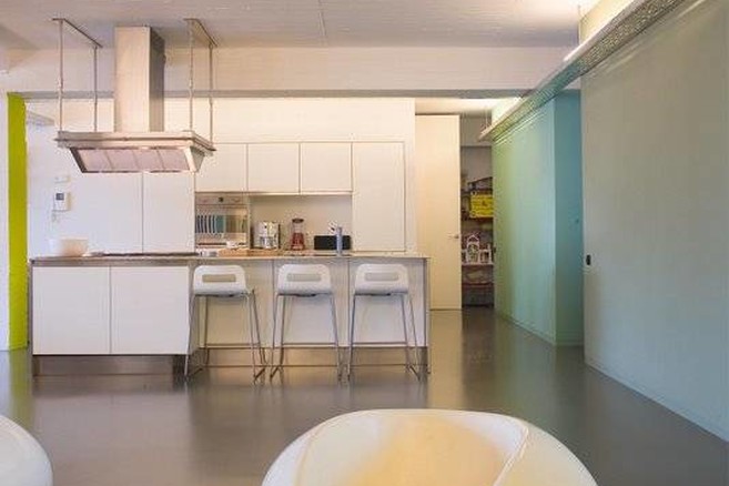 We bijten de spits af met een loftproject van architect Jan Van Rooy. Hij ontwierp voor hem en zijn gezin een woning annex kantoor in een loft. Voor de inrichting van de loft koos de bouwheer voor droogbouw. Dit om de uitvoeringstermijn zo kort mogelijk te kunnen houden. Bovendien koos de architect ervoor te besparen op de chapewerken door de bestaande betonvloer als basis te gebruiken voor de nieuwe polyurethaanvloer. De architect hierover: “De vloer was evenwel in slechte staat, maar door hem op te schuren en te stralen was hij toch geschikt voor de afwerking.”