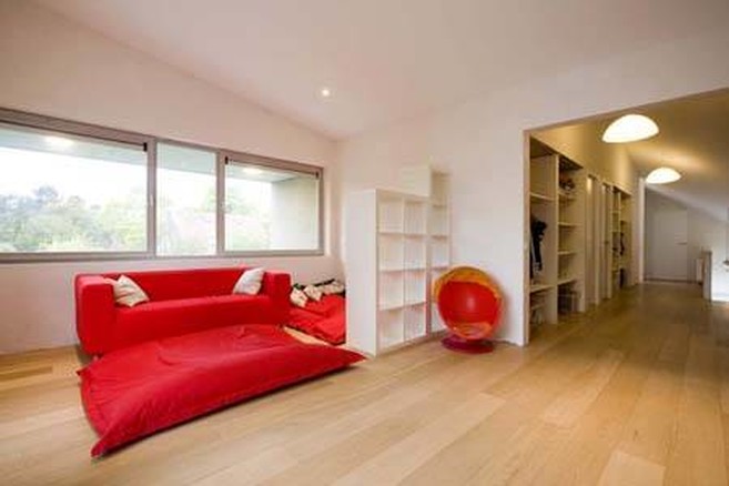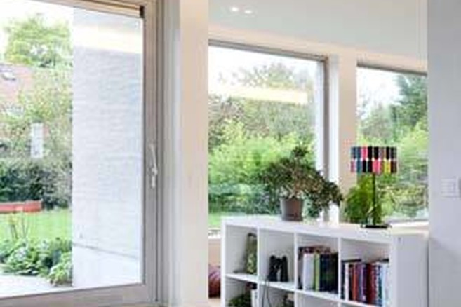 Op de eerste verdieping zijn de ramen op de zuidgeoriënteerde kamers laag geplaatst. Met als dubbele reden dat een hoge zomerse zon niet binnen kan schijnen en er zo ook nog zicht is op de tuin in plaats van op de aanpalende percelen.