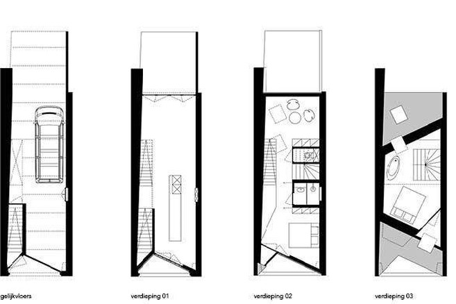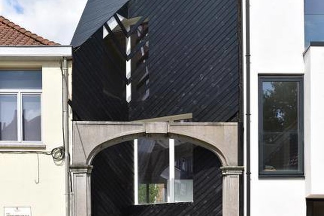 Als je tegenover de “Fou de Gand” staat, wordt je blik gevangen door de discrete maar tegelijk heel aparte gevel. Achter een beschermde stenen boog plooit de gevel asymmetrisch naar de binnenzijde van het perceel, alsof je een steegje binnenstapt. Zo ontstaan in de gevel twee vlakken, voor twee afzonderlijke ingangen: naar de B&B en naar de garage en de eigendom van de bouwheer die er vlak achter ligt. Deze knik levert een veelzijdige kijk op de wijk op, vooral vanaf het kleine balkon op de tweede verdieping.De dynamiek van de gevel wordt nog geaccentueerd door de schuinte in de gevelbekleding en de globale vorm van de woning. De architecten hebben de profielen van de ernaast gelegen panden immers kundig geïntegreerd in een volumetrie die verrast met schuine lijnen. Dit dynamische lijnenspel blijft ook binnen in de woning aangehouden en draagt bij tot de bijzondere identiteit ervan.