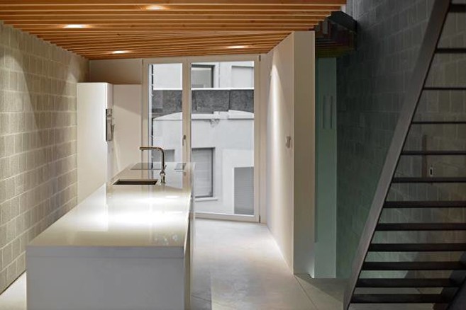 Vanaf de start van het creatieve proces kozen de architecten ervoor om de dragende betonnen muren op te waarderen en ze de identiteit van het project te doen uitstralen. "Wij bouwen graag eenvoudig: materialen gebruiken zoals ze zijn, met al hun expressiepotentieel."Het betonnen metselwerk is zichtbaar gebleven, als afgewerkte wand. De verzorgde uitvoering benadrukt hun structuur, hun reliëf en het regelmatige patroon van de mortelvoegen. Samen met de trap die vanuit het inkomhalletje opklimt en de vloerplaat van het eerste niveau, zijn de twee zijmuren de enige elementen in zichtbaar beton in de hele woning. Ze vormen de solide basis, letterlijk én figuurlijk, waarop het project zich ontwikkelt. De metalen trap, het keukenmeubilair en de sanitaire ruimtes lijken wel voorwerpen die erop of erin geplaatst en geïnstalleerd werden om leven te geven aan het huis.