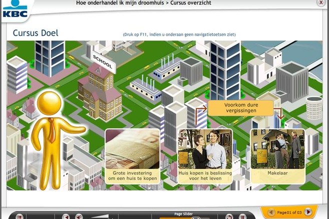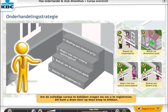 Huis Onderhandelen is voor iedereen gratis toegankelijk. Wie de hele sessie doorloopt, moet daar ongeveer drie kwartier voor uittrekken, maar kan de module ook om het even wanneer stopzetten en later opnieuw de draad oppikken.De toepassing kwam tot stand door een samenwerking van KBC met SIPM, een bedrijf dat zich heeft gespecialiseerd in aankoopmanagement en onderhandelingstechnieken en dat voor deze webtool zelf te rade ging bij een aantal vastgoedmakelaars.