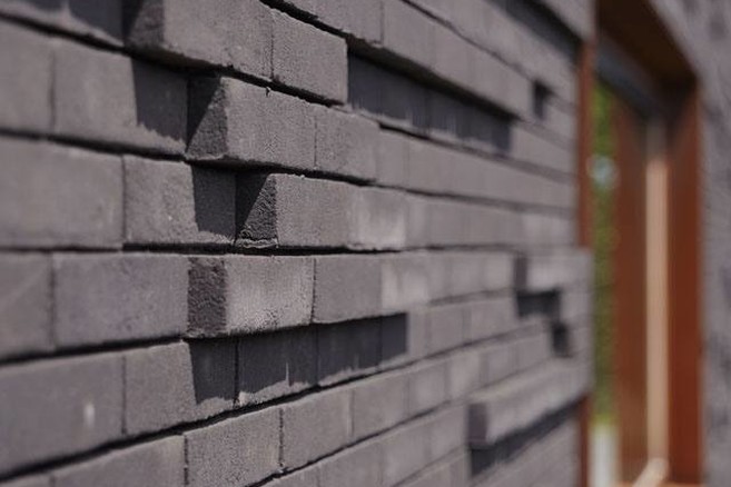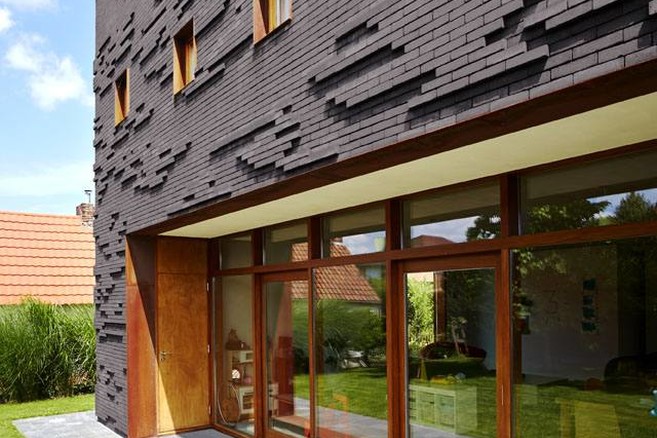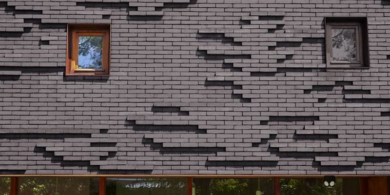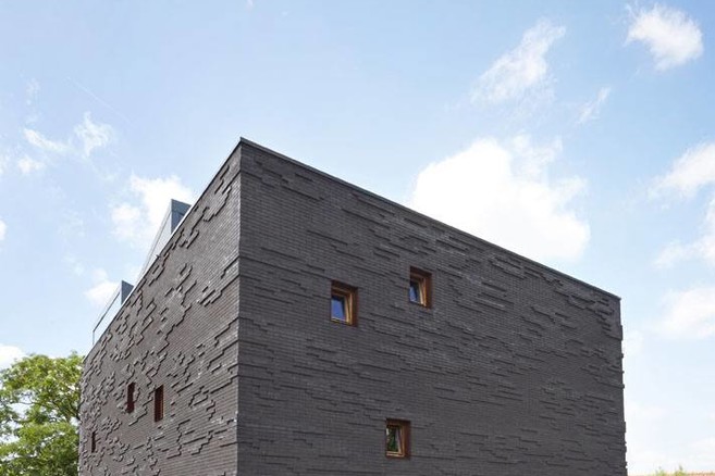 Het speciale metselverband van Terca Etna stenen is een knipoog naar Japanse behangpatronen. Het onderstreept het bevreemdende karakter van de gevel en doorbreekt tegelijk het massieve metsel- werkvolume.Aan de basis van het patroon lagen geen plannen, maar een Excelbestand.