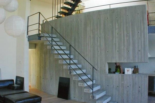 In de wand werden ook de betonnen treden van de trap verankerd, waardoor ze lijken te zweven in de ruimte. Een opening in de wand geeft een speelse inkijk op de keuken, nog een knap staaltje van de goed doordachte scenografie in de woning.