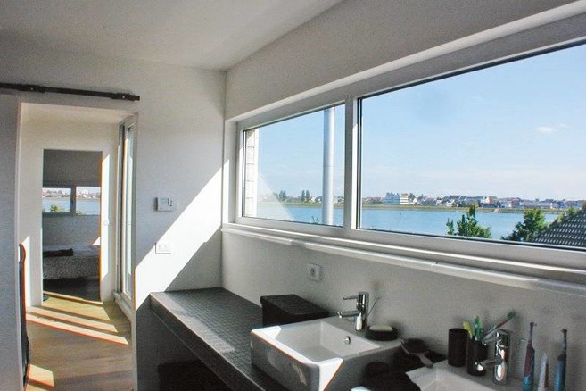 Aan de kant van de straat kreeg de woning een meer gesloten karakter, waardoor de openheid naar het water benadrukt wordt en het zicht geleid wordt naar buiten. Overal in huis heb je door het creatieve ontwerp zicht op het water of op de vuurtoren van Oostende.
