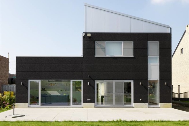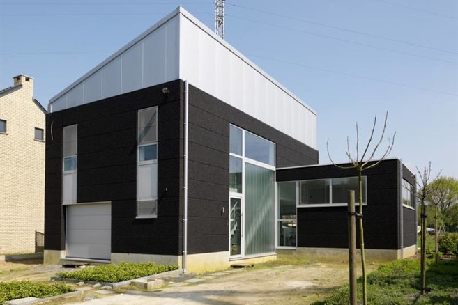 Een warme kubistische woning opgebouwd met een industriële staalskeletstructuur en Hebel-cellenbetonpanelen, die afgewerkt werden met zwarte kwarts. Architect Maryse Vermeiren kreeg het voor elkaar.