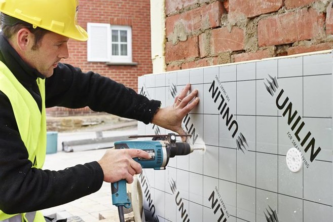- Isolatieplaten aan de buitenzijde kleven met lijm of mechanisch bevestigen