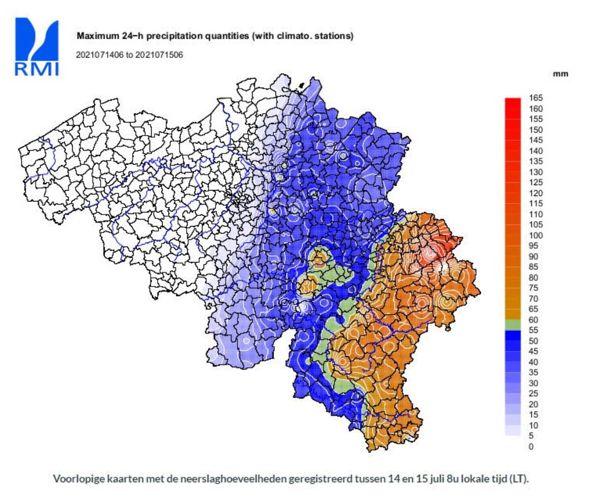 Volgens de Vlaamse milieumaatschappij ligt meer dan 32.000 ha aan harde bestemmingen in overstromingsgevoelig gebied. Dat is bijna 12% van de totale watergevoelige oppervlakte in Vlaanderen, die geraamd wordt op zo'n 277.000 ha. Daarbij gaat het overwegend om bestaande bebouwing, werkplekken en wegen. Heel wat centra en kernen of delen ervan liggen in watergevoelige zones. Zo heeft onlangs de provincie Vlaams-Brabant aangegeven dat meer dan een kwart van haar inwoners woont op een plek met verhoogd risico op overstromingsgevaar. Aangezien een ‘waterbom’ zoals in de provincie Luik ook in Vlaanderen dramatische gevolgen kan hebben, dienen we ons doordacht, nauwgezet en zonder oponthoud voor te bereiden. Dat bevestigt onderstaande kaart die aangeeft dat midden juli de regenval rond Luik driemaal hoger lag dan in het oosten van Vlaanderen. Een wake-upcall.