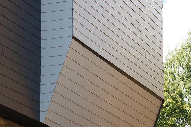 Door de contrasterende kleuren, de verschillende niveaus en de hellende vlakken krijgt de gevel een visueel aantrekkelijke onderverdeling.De in halfsteensverband aangebrachte leien zorgen intussen voor een moderne aanblik.