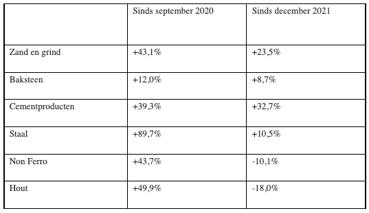 Een aantal bouwmaterialen mogen dan wel in prijs gedaald zijn de afgelopen maanden, door de bank blijven de prijzen van de meest courante bouwmaterialen verder de hoogte in gaan, zoals blijkt uit onderstaande tabel.