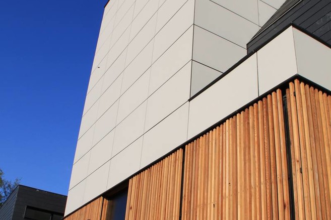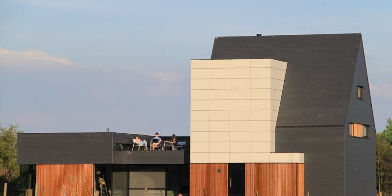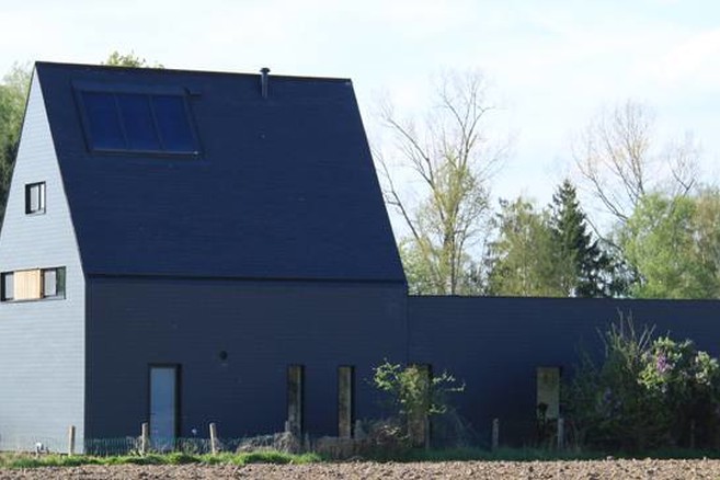 Het invullen van de vraag naar energiezuinigheid begon met het grondig isoleren van de bestaande woning en de nieuwbouw. De keuze viel daarbij op het inpakken van de buitengevel. De nieuwe isolatieschil kreeg vervolgens een opmerkelijke afwerking. Het dak en de gevel van het hoofdvolume zijn aangekleed met vezelcementleien, de traphal kreeg een accent in witte vezelcementpanelen. Verder zijn alle nieuwe, gesloten delen in de westgevel bekleed in cederhouten balkjes. De wisselwerking tussen deze materialen enerzijds en tussen de openheid en geslotenheid anderzijds geeft de woning een heel sterke identiteit. “Vooral het hoofdgebouw is sterk gesloten. Hiertoe hebben we verschillende ramen dichtgemaakt of verkleind,” vertelt Bjorn Vanoppen.