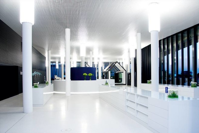 Het opvallende gebouw op stelten langs de E17 in Waregem is een ontwerp van wijlen architect Jo Crepain. Dit geslaagde concept werd in 2003 beloond met een FAB Energy Award en kreeg in 2009 de prestigieuze internationale Green Good Design Award. Het ontwerp en de uitbreiding van dit gebouw werd opnieuw toevertrouwd aan Crepain Binst Architecture en bewust in dezelfde geest en architecturale kracht als het reeds bestaande gebouw uitgewerkt. Het architectuurbureau kreeg de opdracht een uitbreiding te realiseren, die voldeed aan volgende eisen: maximale inval van daglicht, aangename en gezonde luchtkwaliteit, wit als hoofdkleur, een goede akoestiek en de integratie van RENSON-producten (Healthy Building Concept®).“De voormalige open ruimte onder de oversteek van de kantoren werd een experience en meeting center: EXIT 5,” vertelt architect Dirk Engelen. Hoge glaspartijen met dunne aluminiumprofielen zorgen voor een imposante en uitnodigende façade. De golvende glasgevel (136 m lang) begeleidt de voorbijrijdende wagens op de nabijgelegen autoweg, maar duidt ook op de beweging van de (ventilatie)luchtstroom. “Door de verlenging van het bestaande dakterras en het verderzetten van de beglazing wordt het horizontale karakter van het gebouw in verhouding met dit experience en meeting center terug in evenwicht gebracht en de natuurlijke opbouw van de sokkel (EXIT 5) en de bovenbouw (landschapskantoor annex terras) versterkt,” vult de architect nog aan.