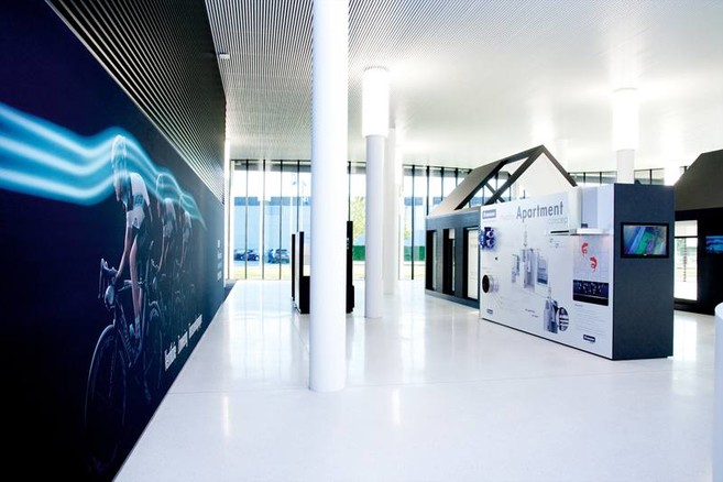 Langs de automatische draaideur komen bezoekers in een multifunctionele showroom met centraal de blauwe toren van de receptiebalie.“Rechts van deze balie bouwden wij een ‘dorp’ met verschillende huisjes, waar consumenten kunnen kennismaken met verschillende aspecten van ventilatie en zonwering,” vertelt communicatieverantwoordelijke Johan Debaere. De bezoeker krijgt er niet alleen een presentatie van de verschillende oplossingen in het RENSON®-gamma, maar ervaart er ook echt wat ventilatie en zonwering voor het klimaat in een gebouw kunnen doen. Waarom ventileren? Zorgt ventilatie voor tocht? Hoe voorkom ik hinder door buitenlawaai? Wat is de invloed van buitenzonwering op de binnentemperatuur? Het zijn één voor één vragen die de consument bezig houden als het gaat om de integratie van ventilatie en zonwering in woningen, appartementen en andere gebouwen.