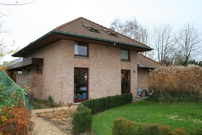 Via vrienden en een opendeurdag kwam het stel bij architect Robby Delobelle terecht. De eerste gesprekken verliepen gemoedelijk en de architect wist hun voorkeur voor een strakkere stijl te appreciëren. Hij behield in zijn ontwerp de structuur van de bestaande woning en liet het piramidedak staan, maar zaagde resoluut de overstekende gedeelten van dat dak weg. De muren werden opgemetseld en er kwam een binnengoot. De oppervlakte van de woning werd nagenoeg verdubbeld door er een uitbreiding aan toe te voegen. Een hoge inkompartij in glas smeedt de twee samen.